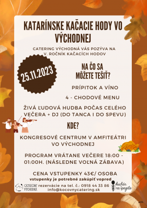 Pozývame vás na V. ročník Katarínskych kačacích hodov vo Východnej. Môžete sa tešiť na výbornú večeru a veselú zábavu pri živej ľudovej hudbe (do tanca i do spevu).